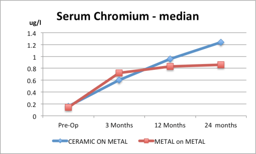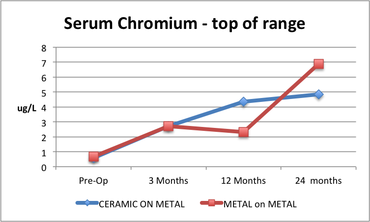 8. Serum chromium for the Ceramic and the Metal-on-Metal are both way above normal range based on the top of the ranges given. Normal concentrations are usually less than 0.35 microgram/L. |