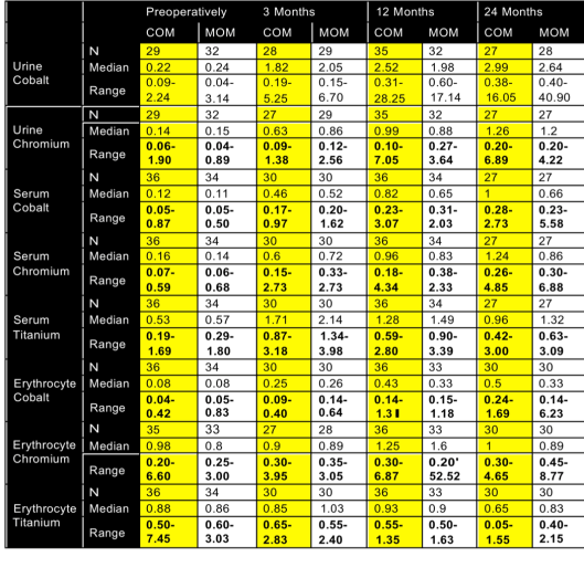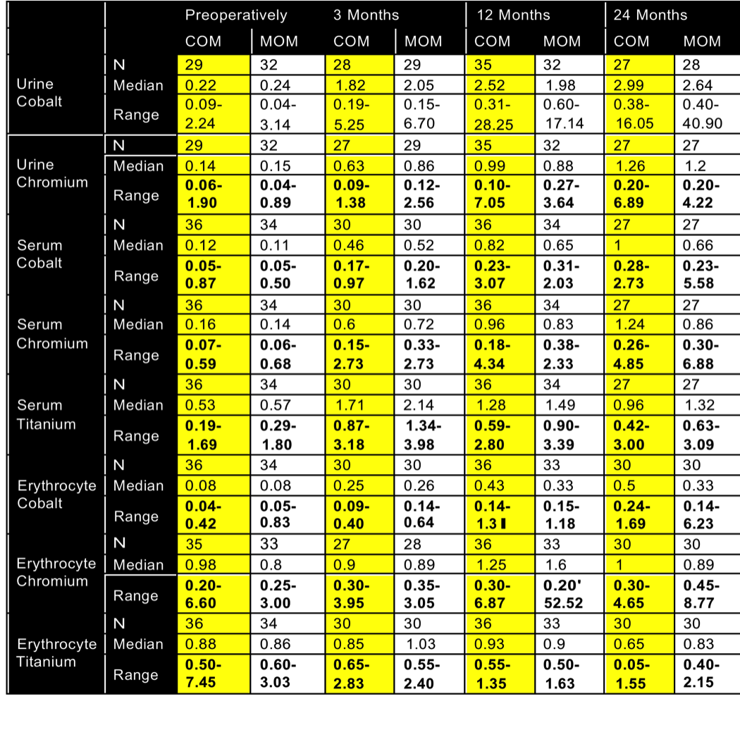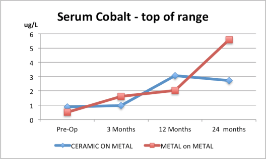 5. Serum cobalt for the Ceramic and the Metal-on-Metal are both way above normal range based on the top of the ranges given. Normal serum values are less than 0.5 microgram/L. |