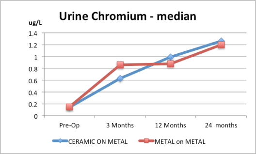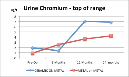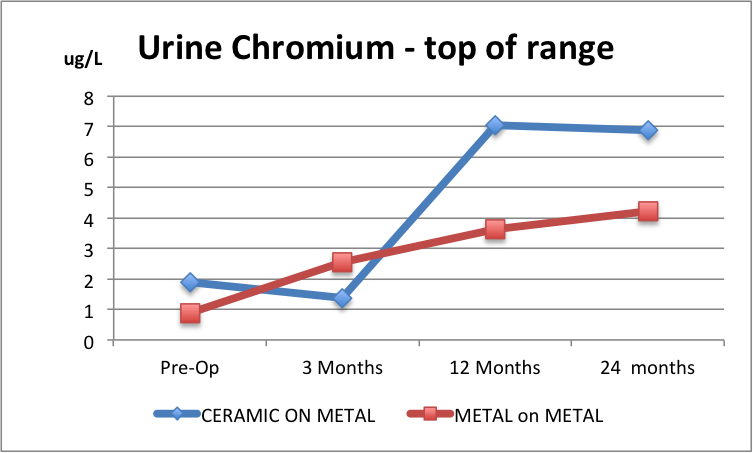 4. Urine chromium for the Ceramic and the Metal-on-Metal are both above normal range based on the median of the ranges given. Normal urinary chromium values are less than 1 microgram/L. |