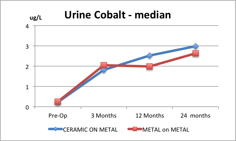 6. Serum cobalt for the Ceramic and the Metal-on-Metal are both above normal range based on the median of the ranges given. Normal serum values are less than 0.5 microgram/L. |