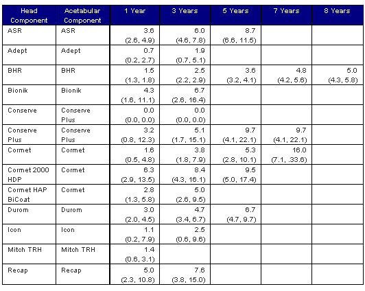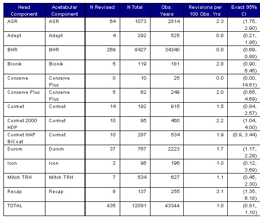 Note: Two resurfacing hip procedures using only a Conserve resurfacing head and no acetabular component have been removed from the above table.