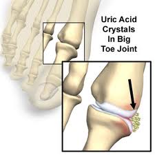 When a person has gout, they have higher than normal levels of uric acid in the blood. The body makes uric acid from many of the foods we eat. Too much uric acid causes deposits, called uric acid crystals, to form in the fluid and lining of the joints. The result is an extremely painful attack of arthritis. The most common joint gout affects is the big toe. This disease is more common in men than in women.