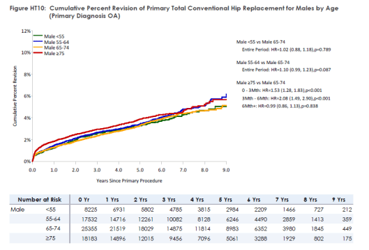 The relationship between risk of revision and age is not apparent for males at nine years. Males under 55 years have a cumulative percent revision of 5.0% compared to 5.7% for males 75 years or older (Figure HT10).