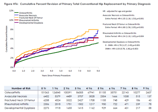 Osteoarthritis has a significantly lower risk of revision compared to developmental dysplasia in the first three months, but there is no difference after this time (Figure HT6).