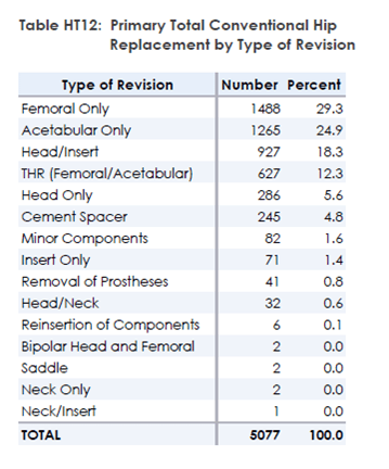 The type of revision used is influenced by the reason for revision. As these change with time, the relative proportion of each type of revision will also change with time. Currently, the five most common types of revision of primary total conventional hip replacement recorded by the Registry are femoral only revision (29.3%), acetabular only (24.9%), head and insert (18.3%), femoral/acetabular (12.3%) and head only (5.6%) (Table HT12).