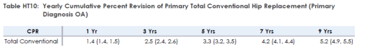 The cumulative percent revision at nine years for primary total conventional hip replacement undertaken for osteoarthritis is 5.2% (Table HT10 and Figure HT4).