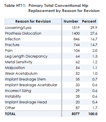 The most common reasons for revisions of primary total conventional hip replacement are loosening/lysis (29.9%), followed by prostheses dislocation (27.6%),infection (16.7%), fracture (14.7%) and pain (2.0%) (Table HT11).