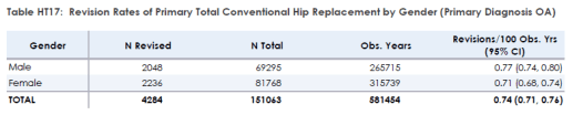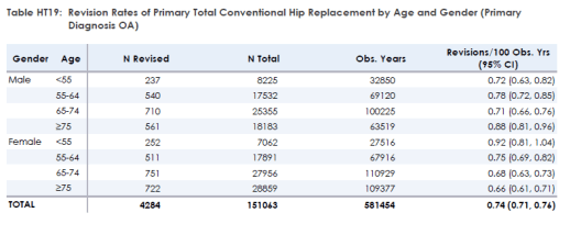 Previously the Registry has not identified a difference in the risk of revision with respect to gender, however, this year it has identified a higher risk of revision for males after one and a half years (Tables HT17 and HT18 and Figure HT8).