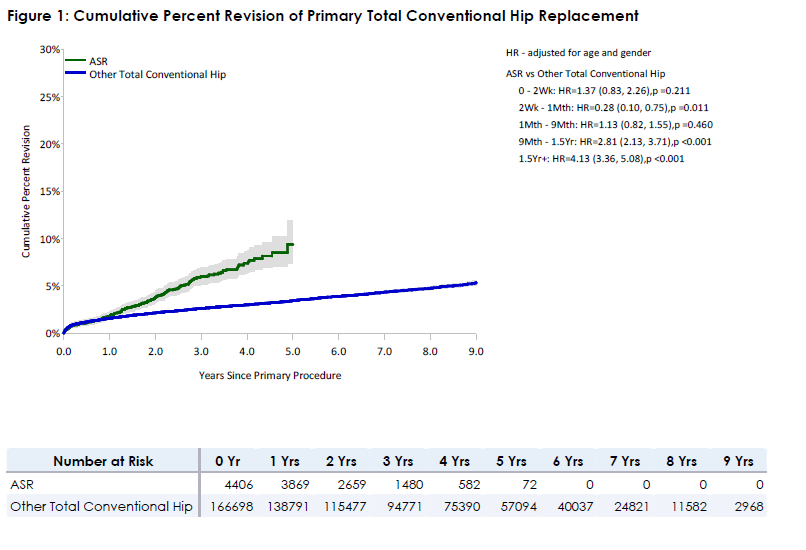 This analysis compares the ASR Total Conventional Hip Acetabular Prosthesis with all Other Total Conventional Hip prostheses. This Acetabular Prosthesis has been identified as having a significantly higher revision rate.