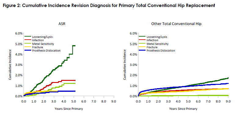This figure details the cumulative incidence of the most common reasons for revision. The five most common reasons for revision are included as long as each of these reasons account for more than 10 procedures or at least 5% of all revisions for the ASR Total Conventional Hip Acetabular Prosthesis . A comparative graph is provided of the cumulative incidence for the same reasons for revisions for all Other Total Conventional Hip prostheses.