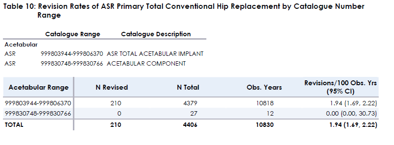 TABLE 10 Revision rates of ASR Primary Total Conventional Hip Replacement by Catalogue Number Range