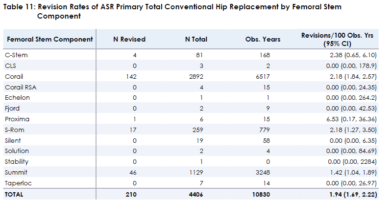TABLE 11 Revision rates of ASR Primary Total Conventional Hip Replacement by Component