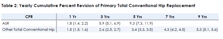 TABLE 2 Yearly Cumulative Percent Revision of Primary Total Conventional Hip Replacement