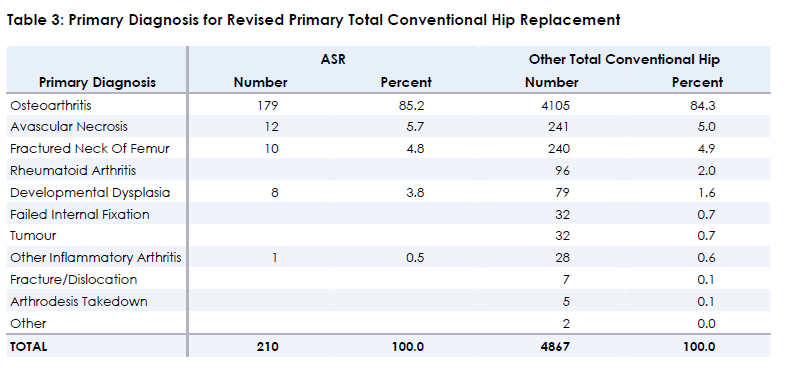 TABLE 3 Primary Diagnosis for Revised Primary Total Conventional Hip Replacement