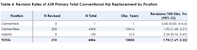 TABLE 4 Revision Rates of ASR Primary Total Conventional Hip Replacement by Fixation.