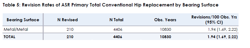 TABLE 5 Revision Rates of ASR Primary Total Conventional Hip Replacement by Bearing Surface.