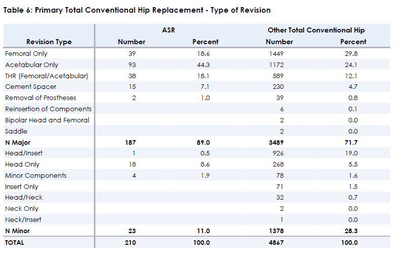 The reason this analysis is undertaken is to identify whether there is one or more components which are being replaced that differ from the components replaced for revisions of all Other Total Conventional Hip prostheses i.e. is there a difference in the type of revision undertaken for the ASR Total Conventional Hip Acetabular Prosthesis compared to all Other Total Conventional Hip prostheses.