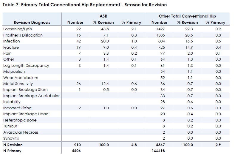 This is reported in two ways; a percentage of all revisions and also as a percentage of all primary procedures. This analysis includes a comparison of reasons for revision to all Other Total Conventional Hip prostheses.