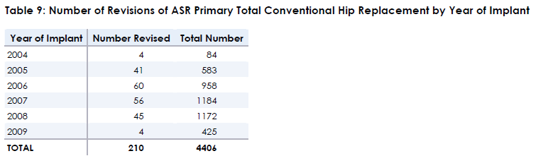 TABLE 9 Number of Revisions of ASR Primary Total Conventional Hip Replacement by Year of Implant