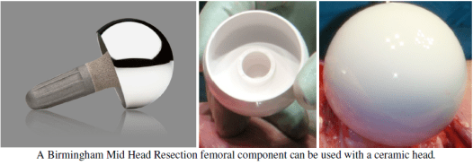 A Birmingham Mid Head Resection femoral component can be used with a ceramic head. Hip simulator testing showed that the wear from a CoM bearing is much lower than the wear from a standard metal-on-metal bearing The BMHR stem was originally developed for use in patients with poor quality bone in the femoral head. These patients with severe cystic change in the femoral head or with osteonecrosis (dead bone in the femoral head) are not ideal candidates for hip resurfacing.