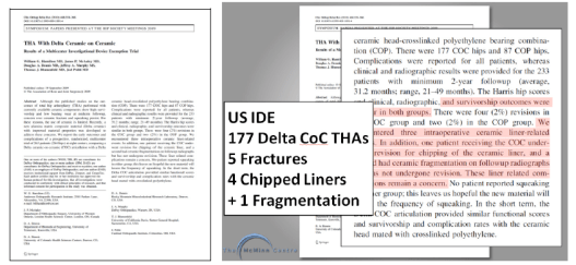 Ceramics are brittle materials and as such are subject to fracture in use. The most modern ceramic is called Delta ceramic and this has strontium and chromium added to increase toughness and hardness. Despite this advance in ceramic manufacture, when used as a ceramic-on-ceramic couple for total hip replacement, the acetabular ceramic liner is still prone to fracture. This is best shown in a published IDE study from the US.