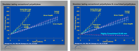 The graph on the left below shows that on laboratory hip simulator, the bigger the femoral head, the greater the wear volume of polyethylene generated. This is however only the case with conventional polyethylene. The graph on the right below shows that when using cross-linked polyethylene, wear volume is independent of femoral head size. This means from a purely wear perspective, cross-linked polyethylene is perfectly suitable for the large femoral heads, inevitable with the use of hip resurfacing.