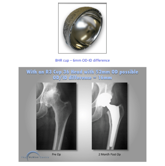 It can clearly be seen that the minimum OD-ID difference of 16mm with a total hip replacement using a titanium acetabular shell and a cross-linked polyethylene liner is quite different to the to the 6mm OD-ID difference using the BHR.