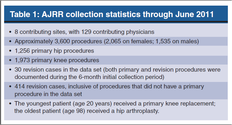 Participating hospitals have been submitting data to the American Joint Replacement Registry (AJRR) for just a few months, but already information on more than 3,600 primary and revision joint replacements has been assembled from eight different reporting sites (Table 1).
