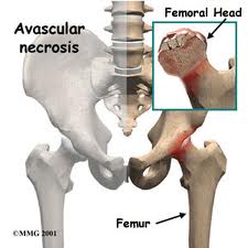AVN is a hip joint problem where the blood supply to the femoral head (ball portion) of the joint is reduced or obliterated. This causes this portion of the bone to die, which leads to the collapse of the effected bone and femoral head surface. There are many causes of AVN such as use of corticosteroids, over consumption of alcohol, fat disorders, nitrogen (divers !) embolism, and other conditions. If the condition does not heal and does not have prosthetic surgery, the joint will normally wear out and become osteoarthritis. Not all preventive surgery for AVN is proven to be effective.
