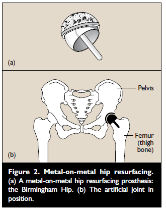 Resurfacing the original socket and the ball of the thigh bone with metal components is a more ‘conservative’ form of hip replacement, which involves the removal of less bone than the usual hip replacement operation. Instead of removing the head of the thigh bone and replacing it with an artificial ball, a hollow metal cap is fitted over the head of the thigh bone. An MOM resurfaced hip joint is shown in Figure 2.