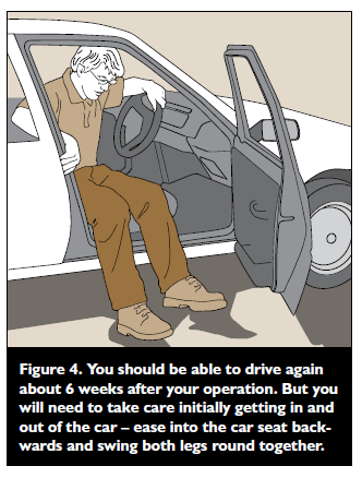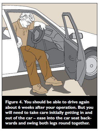 You can expect to drive again after about 6 weeks, and you could return to work at this stage, but only if you have a job which does not mean too much moving around. Getting in and out of a car can be difficult – you will need to sit sideways on the seat first and then swing both your legs around together (see Figure 4).