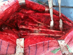 This is a picture taken during my second revision, for those who haven’t read my previous story I had my first revision in November 2010, in late September 2011 I stood up from a chair at home and snapped the titanium stem in my femur clean in half without breaking the bone. This photo was taken by the surgeon during the second revision. The reason my stem snapped was because the metallosis in my femur had killed off or necrosed the bone and this allowed the stem to ‘flex’ as it hadn’t adhered to the bone as it was intended to do. The silvery, shiny section within my femur is the ‘evidence’ of metallosis, this was the point at which my stem snapped, I subsequently had an Osteotomy (splitting of the bone) for the surgeon to be able to retrieve the bottom portion of the stem.
