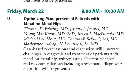 I am worried as much about what will not be presented at this year’s meeting as what will be presented. I agree that not all the members of the selected symposium are dyed in the wool metal-metal hip advocates but they are all entangled with surgeons that are, or with arthroprosthetic companies that might be bankrupted by their metal-metal hip liabilities.